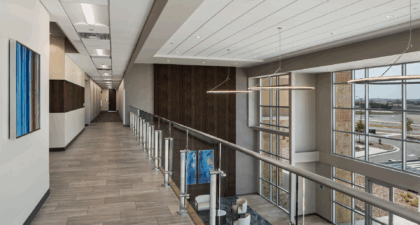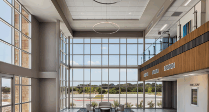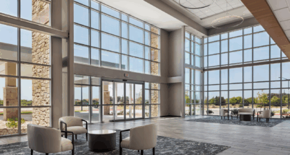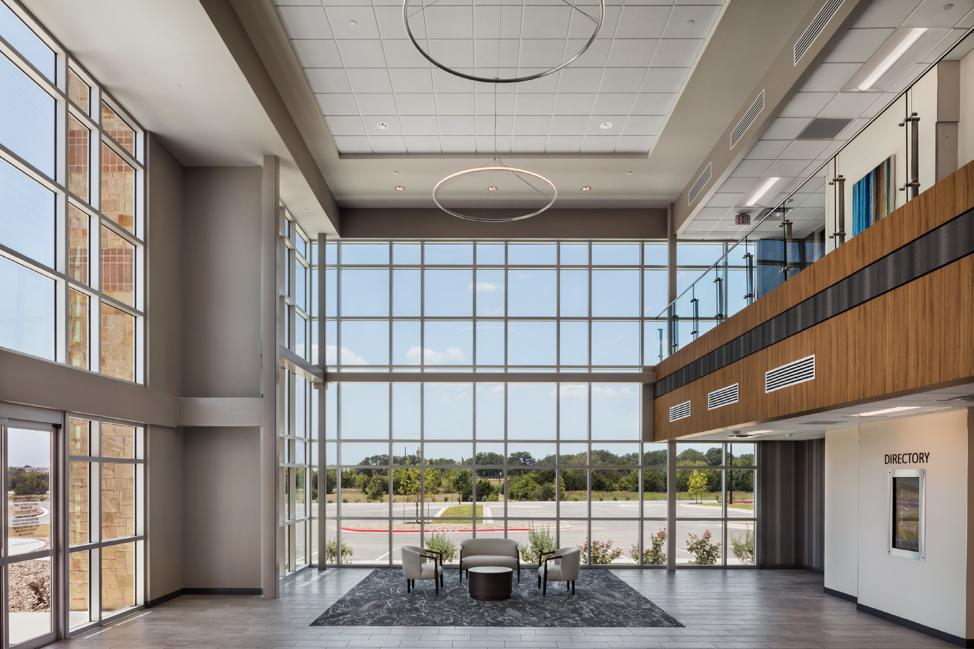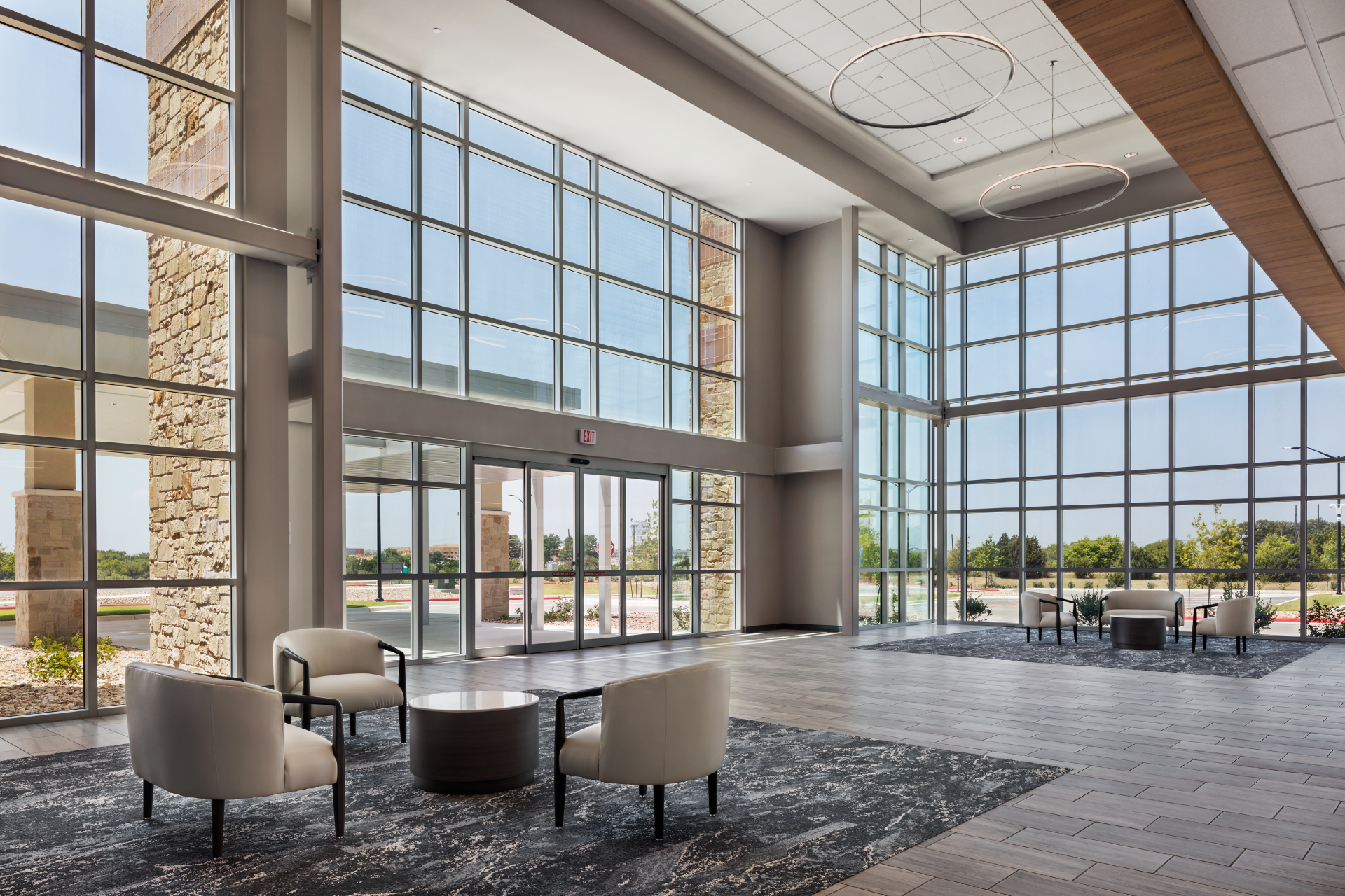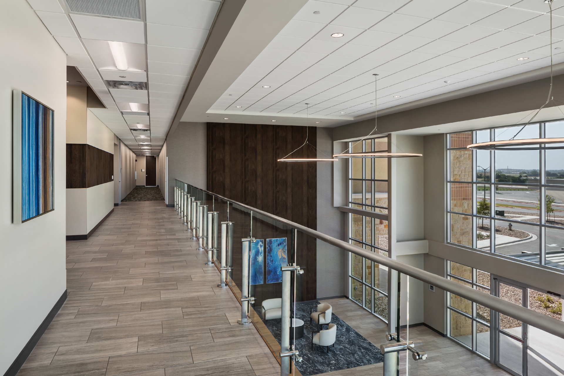 The three-story floor plan optimized for diverse medical, administrative, and business tenants, with an anticipated expansion on the first floor. The entrance features an elevated, two-story atrium flooded with natural light. Custom-curated art and soft seating create a welcoming atmosphere, enhanced by graceful honeycomb lighting fixtures. Strategic space planning ensured high leasable area efficiency while delivering impressive public zones that appeal to prospective tenants.