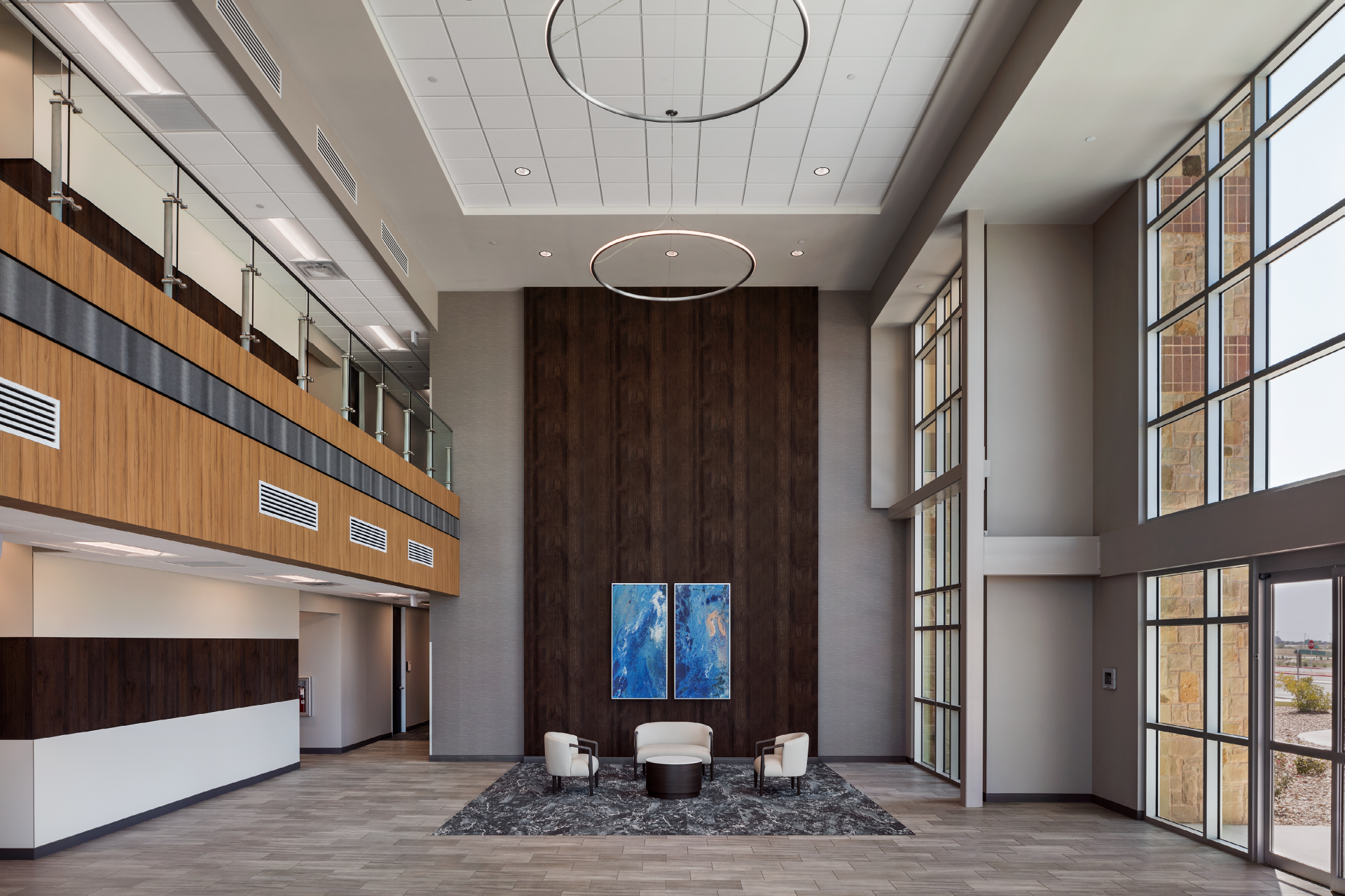 The three-story floor plan optimized for diverse medical, administrative, and business tenants, with an anticipated expansion on the first floor. The entrance features an elevated, two-story atrium flooded with natural light. Custom-curated art and soft seating create a welcoming atmosphere, enhanced by graceful honeycomb lighting fixtures. Strategic space planning ensured high leasable area efficiency while delivering impressive public zones that appeal to prospective tenants.